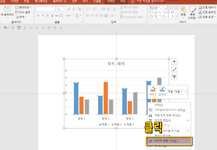2. 다음으로 차트 안에 개체를 선택해준 다음 마우스 우클릭 통해 메뉴를 불러와주도록 합니다. 표시된 부분과 같이 [데이터 계열 서식] 항목을 클릭해주도록 합니다.