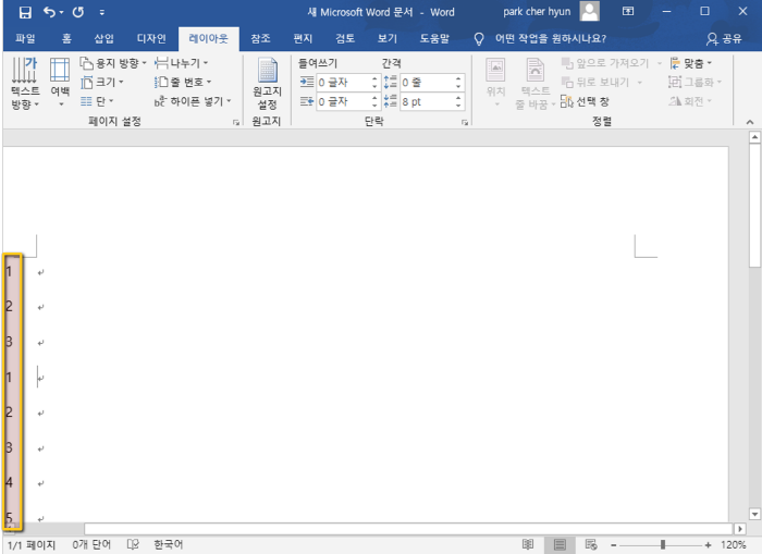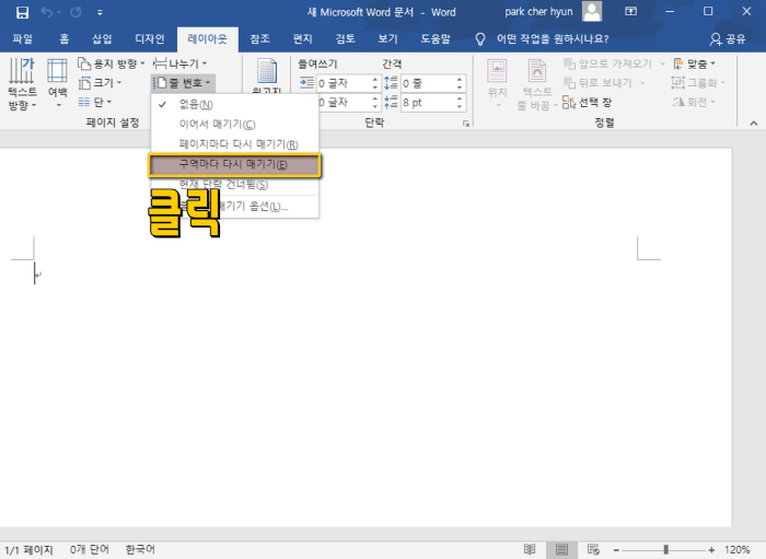 1. 해당 옵션을 활용하기 위해서는 우선 line numver를 [구역마다 다시 매기기] 항목을 선택해주도록 합니다. 이는 상단 메뉴 중 [레이아웃] 항목을 통해서 접근할 수 있습니다.