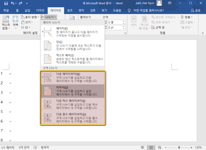 2. 다음으로 원하는 위치에 커서를 맞춰 놓고 [나누기] 항목을 선택해주도록 합니다. 그리고 나서 [구역 나누기] 항목에서 [이어서] 옵션을 선택해주도록 합니다.