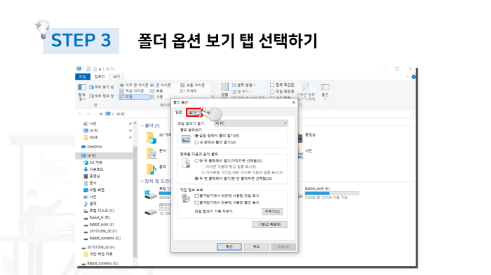 이전 단계를 마치게 되면 다음과 같이 폴더 옵션 창이 새롭게 팝업되는 것을 확인할 수 있습니다. 상단에 위치한 메뉴들 중에서 보기 항목을 선택해주도록 합니다.