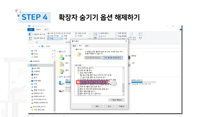 마지막으로 고급 설정 항목에서 스크롤을 내린 다음 하이라이트 된 부분과 마찬가지로 알려진 파일 형식의 파일 확장명 숨기기 옵션을 클릭하여 옵션 토글을 해제해주도록 합니다. 이상의 과정을 통해서 윈도우10에서 표시되는 확장자를 상시 확인할 수 있습니다.