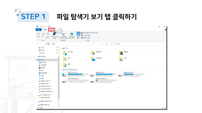 가장 먼저 내 PC나 파일 탐색기를 실행시켜주도록 합니다. 상단에 위치하고 있는 탭 메뉴들 중에서 표시된 부분과 같이 보기 탭 메뉴를 클릭해주도록 합니다.