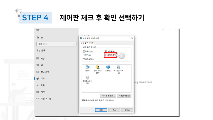 앞선 과정들을 통해서 다음과 같이 바탕화면 아이콘 설정 창을 확인할 수 있습니다. 바탕화면 아이콘 옵션 창에서 하이라이트된 부분처럼 제어판 항목을 클릭하여 옵션을 활성화시켜 주도록 합니다. 마지막으로 확인 버튼을 클릭하게 되면 바탕화면에 새롭게 제어판 아이콘이 나타난 것을 확인할 수 있습니다.