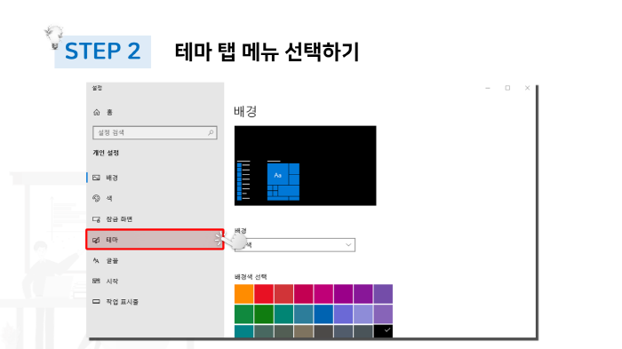 이전 단계를 마치게 되면 다음과 같이 개인 설정 창이 활성화되는 것을 확인할 수 있습니다. 좌측에 위치하고 있는 탭 메뉴들 중에서 하이라이트 된 부분과 마찬가지로 테마 항목을 선택해주도록 합니다.