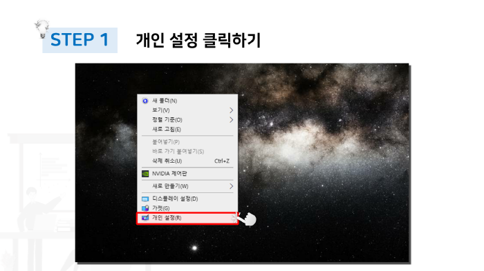 가장 먼저 바탕화면서 마우스 우클릭을 통해 바탕화면 메뉴를 불러와주도록 합니다. 다음으로 표시된 부분처럼 개인 설정 항목을 클릭해주도록 합니다.