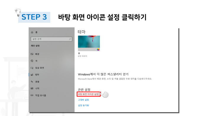다음으로 테마 항목에서 스크롤을 내려 표시된 부분처럼 바탕 화면 아이콘 설정 항목을 클릭해주도록 합니다.