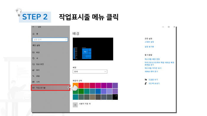 이전 단계를 마치게 되면 다음과 같이 개인 설정창이 활성화되는 것을 확인할 수 있습니다. 좌측에 위치하고 있는 메뉴들 중에서 표시된 부분과 마찬가지로 작업표시줄 항목을 클릭해주도록 합니다.