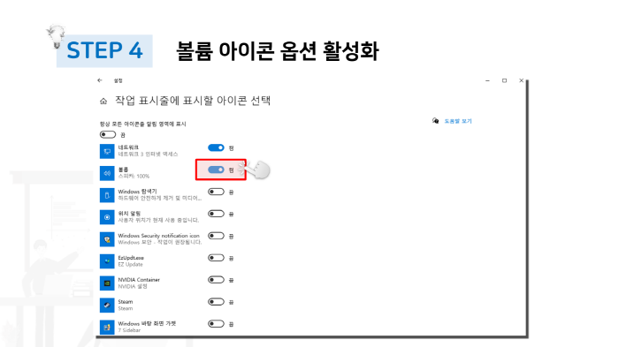 앞선 과정을 마치게 되면 다음과 같은 화면은 보실 수 있습니다. 작업 표시줄에 표시할 아이콘 선택 항목 중에서 볼륨 부분의 옵션을 클릭하여 옵션 토글을 활성화 시켜주도록 합니다. 이상의 과정을 통해서 작업표시줄 우측 하단에 다시 볼륨 조절 아이콘을 생성할 수 있습니다.
