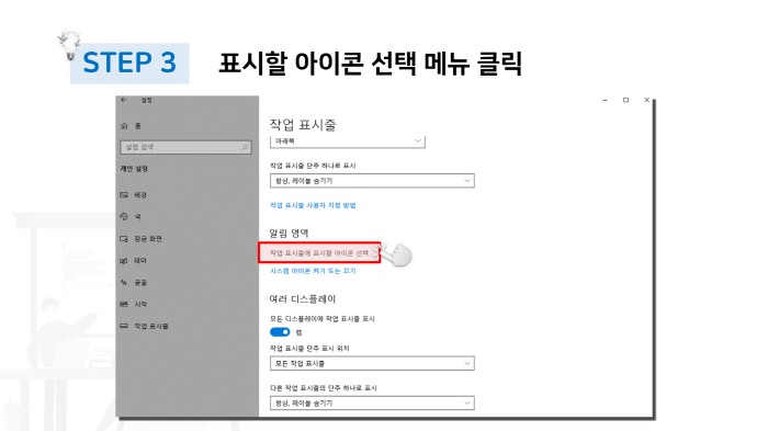 스크롤을 내린 다음 알림 영역에서 작업표시줄에 표시할 아이콘 선택 메뉴를 찾아 클릭해주도록 합니다.