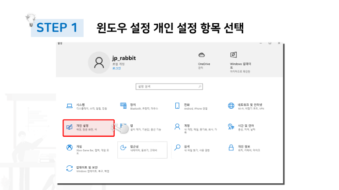 우선 작업표시줄 하단의 시작 버튼을 누른다음 톱니바퀴 모양의 설정 아이콘을 클릭해주도록 합니다. 이를 통해 윈도우 설정창으로 접근할 수 있습니다. 윈도우 설정 메뉴들 중에서 하이라이트 된 부분과 마찬가지로 개인 설정 메뉴를 찾아 클릭해주도록 합니다.
