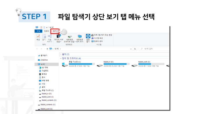 우선 윈도우 파일 탐색기를 실행 시키거나 내 pc를 눌러주도록 합니다. 상단에 위치하고 있는 탭 메뉴들 중에서 하이라이트 된 부분과 마찬가지로 보기 항목을 찾아 선택해주도록 합니다.
