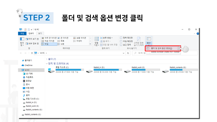 앞선 과정을 마치게 되면 다음과 같이 하위 메뉴가 새롭게 오픈되는 것을 확인하실 수 있습니다. 이중에서 옵션 단추를 클릭한 다음 표시된 항목과 마찬가지로 폴더 및 검색 옵션 변경 메뉴를 클릭해주도록 합니다.
