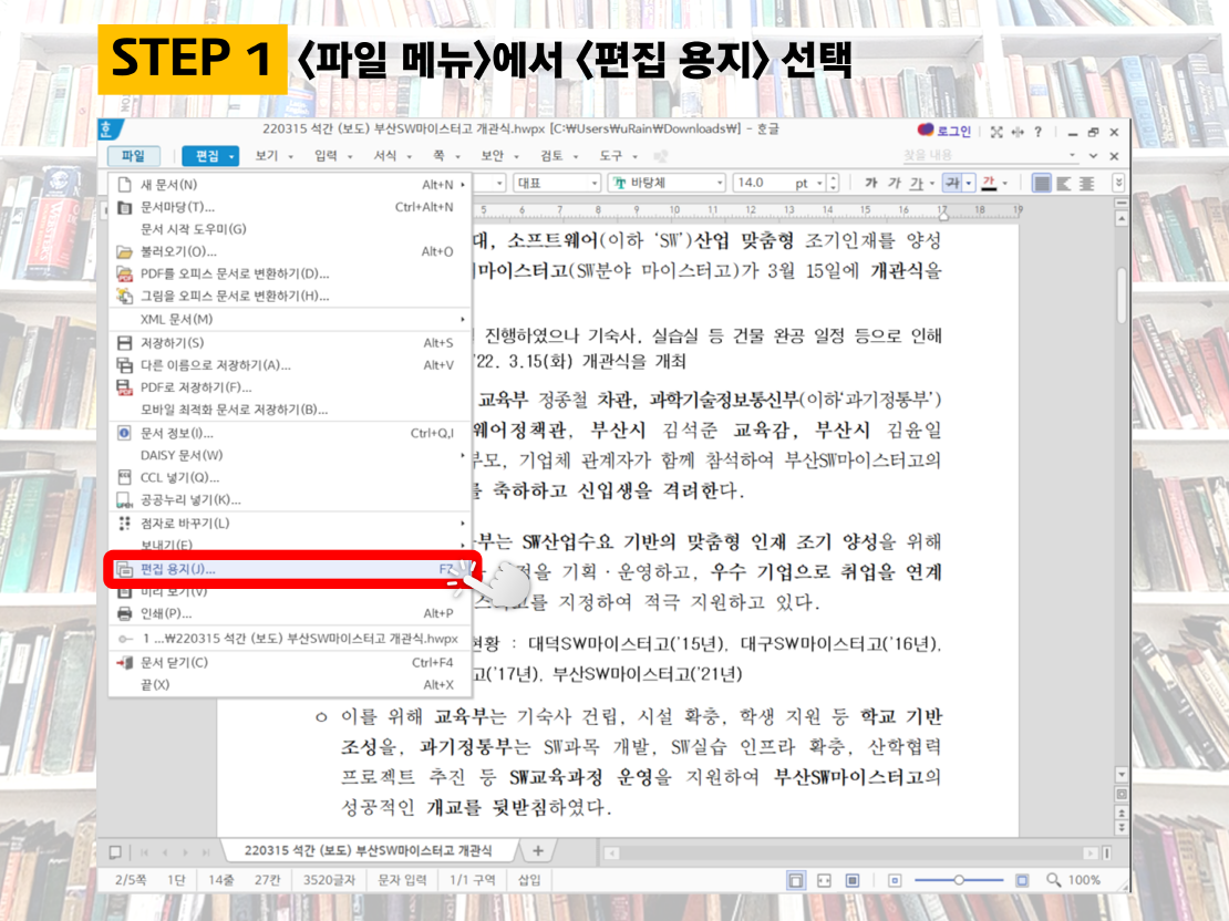 STEP1. 용지 크기를 변경하고 싶은 파일을 열어서 상단 메뉴에서 <파일>을 클릭하면 아래와 같이 <편집 용지> 메뉴를 발견할 수 있습니다.