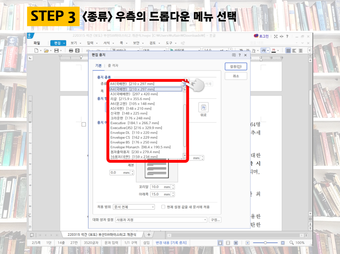 이를 위해 드룹다운 메뉴를 클릭하면 아래 이미지처럼 A4(국배판), A3(국배배판), 리갈, A6(문고편) 등 다양한 크기를 볼 수 있습니다.