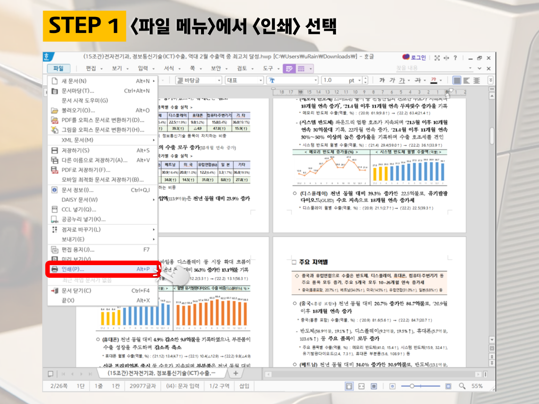 STEP 1. 우선 해당 메뉴로 이동을 하기 위해 상단의 <파일> 메뉴를 누르시고 서브메뉴의 <인쇄>를 클릭!
