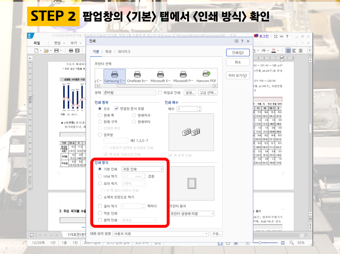 STEP 2. 띄어진 윈도우에서 기본탭이 선택되어 있다면 하단의 <인쇄 방식>을 살펴봅니다.