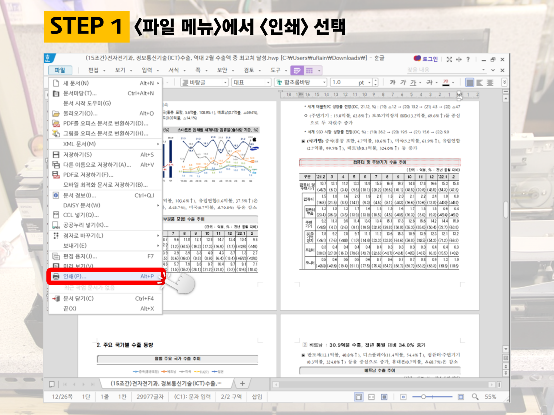 STEP 1. 보시는 것처럼 파일 메뉴를 여신 후, 아래 부분에 있는 인쇄를 클릭(단축키 Alt+P)합니다.