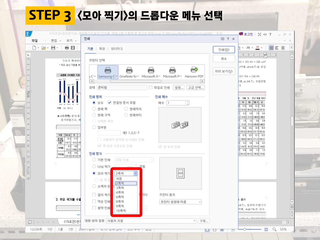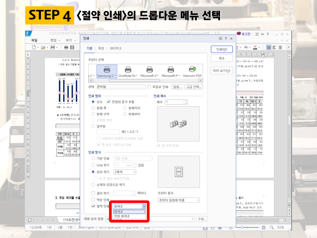 STEP 3. 본 포스팅에서는 앞서 기술한 여러 인쇄 방식중에서 모아찍기와 절약 인쇄만 알아보겠습니다.