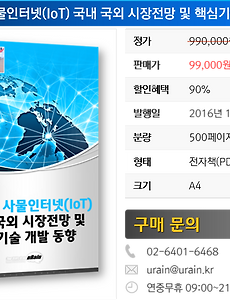 사물인터넷 국내 국외 시장 전망 및 핵심 기술 개발 동향 - 2016년 IoT 아울러 본 보고서에는 관련 시장 전망 및 동향을 다루면서 스마트카, 스마트홈, 스마트 융합기기, 시큐리티, 스마트 러닝, M2M 지능통신, 헬스케어 등 다양한 유관 분야에 대해 기술하고 있습니다. 특히 플랫폼 단위로 구성 요서를 살펴보면서 이를 하드웨어 플랫폼, 디바이스 플랫폼, 커넥션 플랫폼, 데이터 플랫폼 등으로 세분화하였고 플랫폼 별로 비교 분석하는 내용을 추가하였습니다. 핵심기술로 판단되는 Application Processor, Communication Processor, Memory, Actuator, Sensor, Battery를 자세히 기술하고 있습니다. 표준에 관해서는 ITU-T, 3GPP, IEEE, Alls..